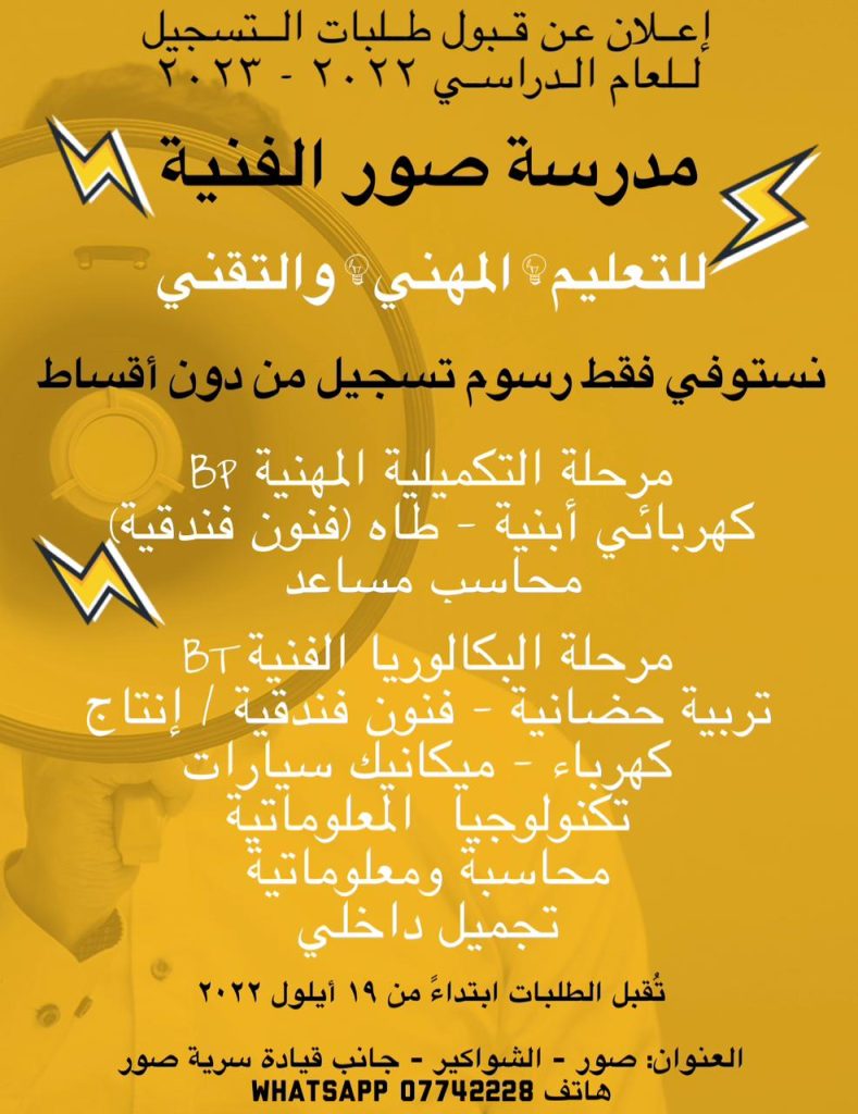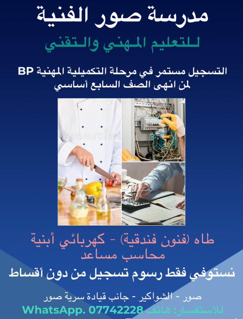تُعلن مدرسة صور الفنية للتعليم المهني والتقني عن إستمرار قبول طلبات الانتساب وتسجيل الطلاب في المراحل والاختصاصات التالية:
