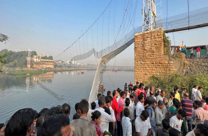 ونقلت وسائل إعلام محلية عن مسؤولين قولهم إن حوالى 500 شخص، بينهم نساء وأطفال، كانوا على جسر موربي يؤدون طقوسا لمهرجان ديني رئيسي حين انقطعت الأسلاك التي تدعمه ما أدى إلى انهيار الهيكل بكامله في النهر.