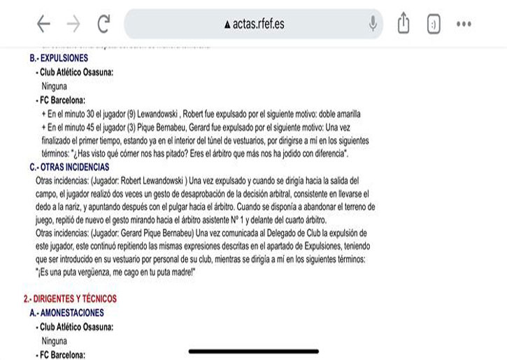 طرد مانزانو بيكيه بعد ذلك وأبلغ مندوب برشلونة بما حدث، ليواصل اللاعب تكرار الإهانات ضد الحكم وهذا ما وضحه في التقرير بعدما قال المدافع: “ما تفعله عار وسخيف، اللعنة عليك وعلى والدتك اللعينة”.