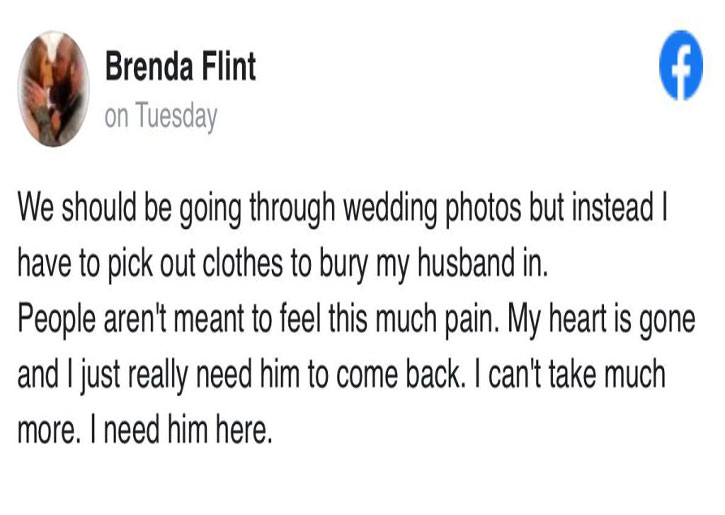 وكتبت: “من المفترض أن نقوم بتصفح صور زفافنا الآن ولكن عوضاً عن ذلك، أقوم باختيار الملابس التي سأدفن فيها زوجي”.