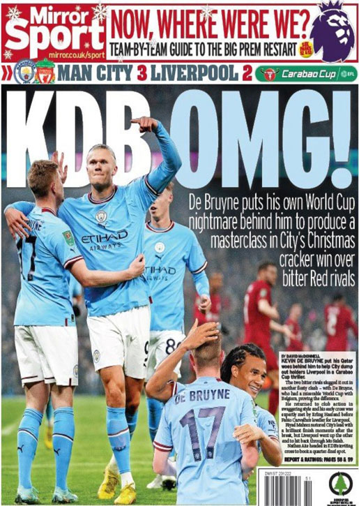 وعنونت صحيفة ميرور “كيفين دي بروين يضع كابوسه الخاص بكأس العالم خلفه، ويقدم درسا في فوز المان سيتي في الكريسماس على غريمه الأحمر”.