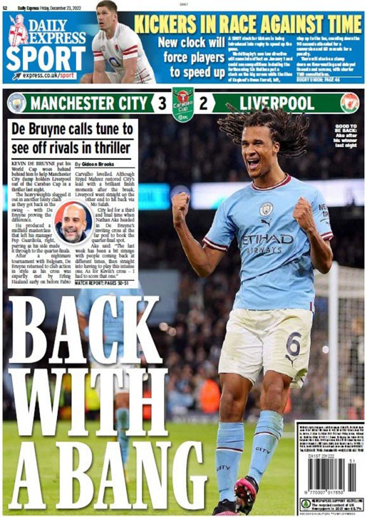 بدورها عنونت صحيفة ديلي إكسبريس “عودة بصخب.. كيفين دي بروين يتحكم في وداع الغريم في مباراة مثيرة”.