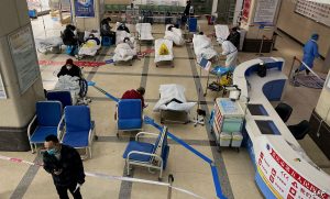 وتقول الصحيفة إن المرضى الذين يجلسون على كراسي متحركة ويستلقون على الأرض أحيانا يحتشدون في كل زاوية وركن في قسم الطوارئ في المستشفى في شمال الصين، كما إنهم يحشرون في المساحات الضيقة بين أبواب المصاعد ويصطفون قرب جدران الممرات.