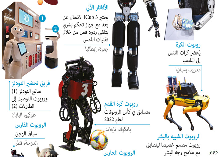أما في قطر، فسلطت فرانس برس الضوء على الروبوت الفارس في سباق الهجن، وفي دبي الروبوت الحارس “أميكا” الذي يرحب بزوار متحف المستقبل، وكذلك روبوت كرة القدم في تايلاند، والأفاتار الآلي في إيطاليا.