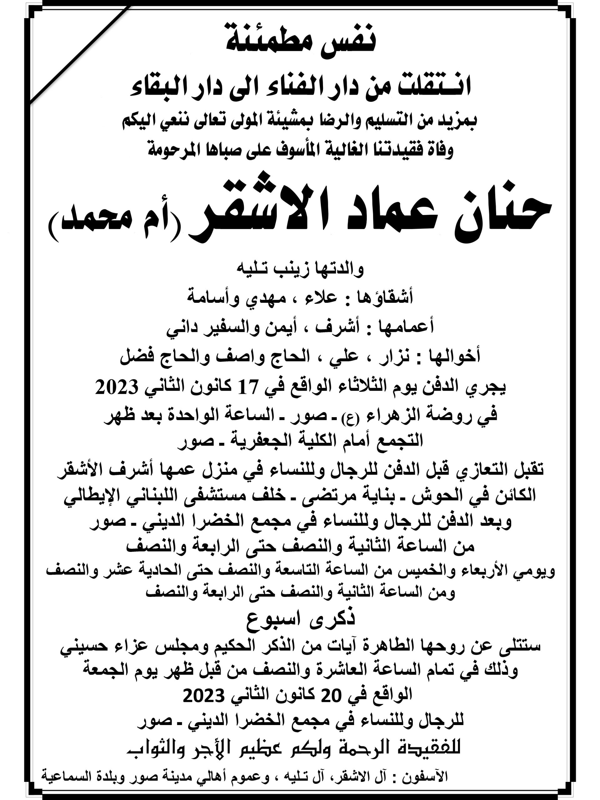 وفيات وفاة حنان عماد الأشقر (أم محمد).. والدفن الثلاثاء الساعة 4:00 By F.S يناير 16, 2023 لا توجد تعليقات الأشقر