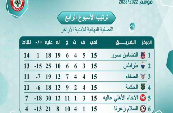 بعد انتهاء مباريات المرحلة الرابعة من دورة التصفية النهائية للاندية الاواخر لبطولة الدوري العام للدرجة الاولى لموسم 2022- 2023 في كرة القدم بفوز التضامن صور على السلام بنتيجة 2-0 وخسارة الاخاء من الصفاء 1-0 وتعادل كل من طرابلس والحكمة سلبيا اصبح ترتيب سداسية الاواخر على الشكل التالي: