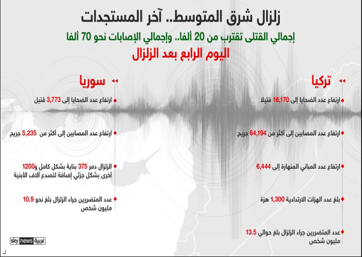 وأعلن مسؤولون ومسعفون أن إجمالي القتلى جراء زلزال شرق المتوسط ارتفع في تركيا إلى 16,170 شخصا و3,773 في سوريا، وفقا للمرصد السوري لحقوق الإنسان، لترتفع الحصيلة غير النهائية للقتلى في البلدين إلى 19,843 قتيلا.