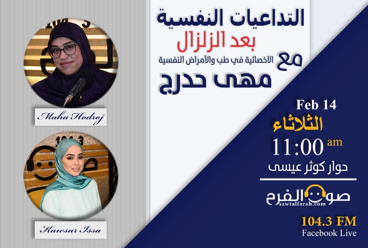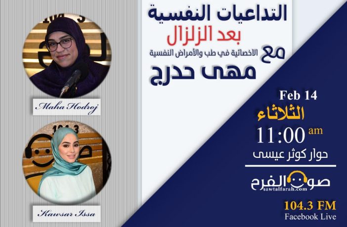 محليات التداعيات النفسية بعد الزلزال By AF فبراير 13, 2023 لا توجد تعليقات التداعيات النفسية بعد الزلزال.. مقابلة مع الأخصائية في الطب والأمراض النفسية مهى حدرج عبر أثير اذاعة صوت الفرح وعبر صفحة الفيسبوك الثلاثاء 14 شباط 11:00am حوار كوثر عيسى الزلزال