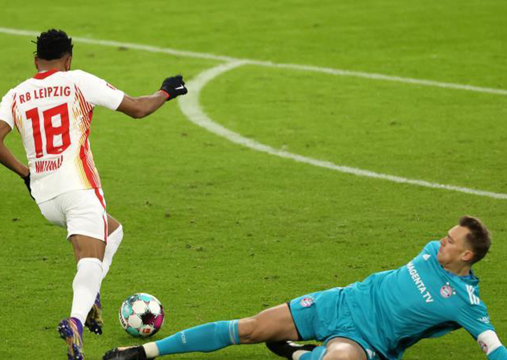 ومن هجمة سريعة، أرسل فورسبيرج تمريرة بينية رائعة إلى نكونكو، ليحاول نوير منعه من التقدم بخروجه من منطقة الجزاء، لكن لاعب لايبزيج راوغه بمهارة ووضع الكرة بسهولة داخل الشباك.
