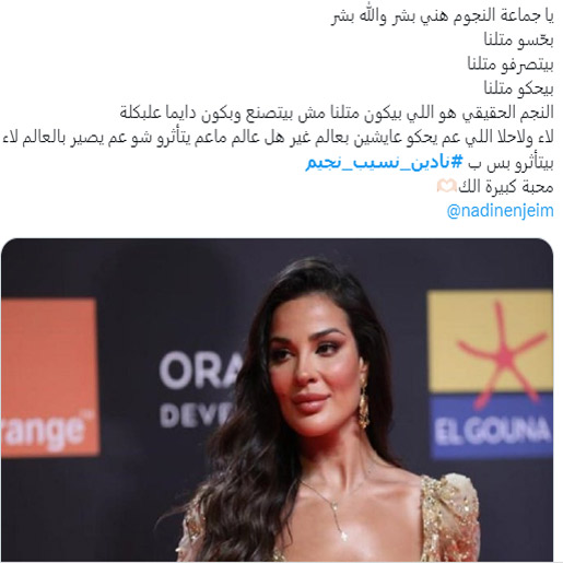 وعلقت الصحافية إيناس كريمة واعتبرت أن “رد فعل نادين نجيم برأيي سقطة كبيرة لممثلة معظم الناس بتّابعها.. لا مجال لشتم الأشخاص بكلمة مرتبطة بمهنة! جميع المهن شرف، وكفى باللقمة الحلال من عرق الجبين!”.