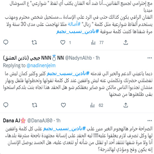 تعليقات أخرى ساندت نادين، وأبرزهم نضال الأحمدية التي هاجمت ديما صادق ودافعت عن نادين وكتبت: “إلى المذيعة المدافعة عن الزبال، وإلى المعتدين على نادين نسيب نجيم، باللبناني السلانغ، بقول انكن زبالين بالجملة والمفرق. زبال عبارة يستخدمها كل لبنان سراً ضد من يعتدي عليه، لكن حين تقولها نادين علناً تصبح جريمة. يلعن النفاق والاستعراض ويلعن ساعتكن”.