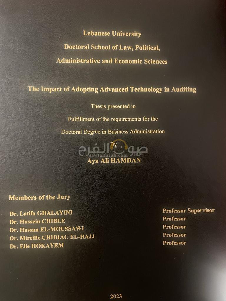 أطروحة الدكتوراه للباحثة حمدان ناقشتها في المعهد العالي للدكتوراه في الحقوق والعلوم السياسية والإدارية والاقتصادية في الجامعة اللبنانية، أمام اللجنة المؤلّفة من البروفسورة لطيفة غلاييني المشرفة على الأطروحة، وعضوية كل من البروفسور حسين شبلي، والبروفسور حسن الموسوي، والبروفسورة ميراي شدياق، والبروفسور إيلي حكيّم، وبحضور عميد المعهد البروفسور خليل دحداح.