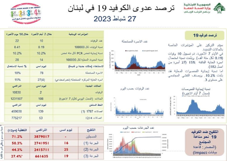 اعلنت وزارة الصحة العامة في تقرير مساء اليوم عن حالات كورونا تسجيل ” 108 اصابات رفعت العدد التراكمي للحالات المثبتة الى 1231907، كما تم تسجيل حالتي وفاة “.