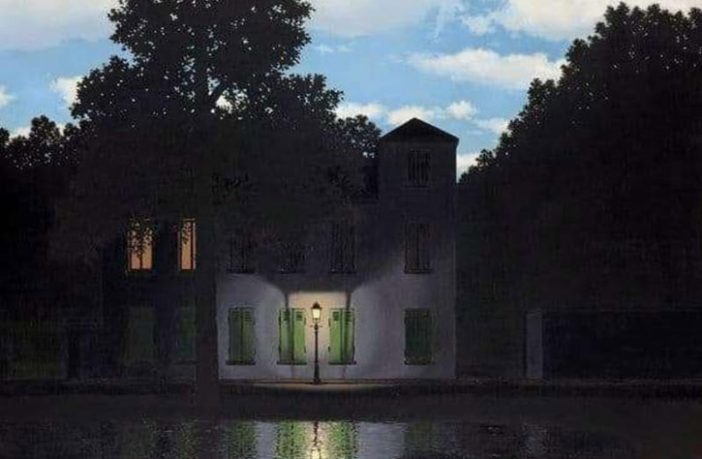 تصوّر لوحة L’empire des lumières المرسومة في عام 1961، شارعاً مظلماً ومنزلاً بنوافذ مضاءة تحت سماء مشمسة في النهار.