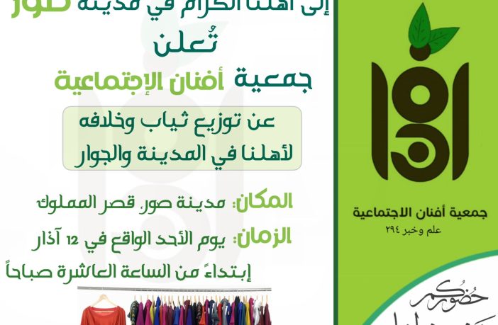 محليات جمعية أفنان الاجتماعية تعلن عن توزيع ثياب وخلافه لأهالي مدينة صور والجوار هذا الأحد By AF مارس 8, 2023 لا توجد تعليقات جمعية أفنان الإجتماعية