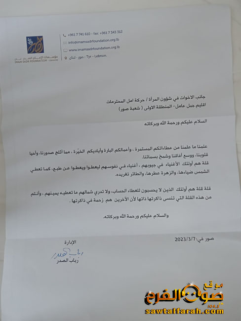 كمّا ونوهت مديرة مؤسسات الإمام الصّدر السّيدة رباب الصّدر، بأنشطة شؤون المرأة مباركة لهن جهودهن شاكرةً لهن هذه المبادرة الجميلة التي أدخلت السرور على قلب الفتيات.