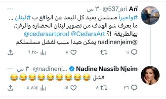 وفي هذا السياق، ردّت نادين نجيم على أحد المتابعين الذي كتب لها تغريدة على تويتر جاء فيها “وأخيرا مسلسل بعيد كل البعد عن الواقع بـ لبنان ما بعرف شو الهدف من تصوير لبنان الحضارة والرقي، بهالطريقة يمكن هيدا سبب لفشل مسلسلكم، لتردّ نادين بكلمة “فشل مع رموز تعبيرية لوجوه ضاحكة”.
