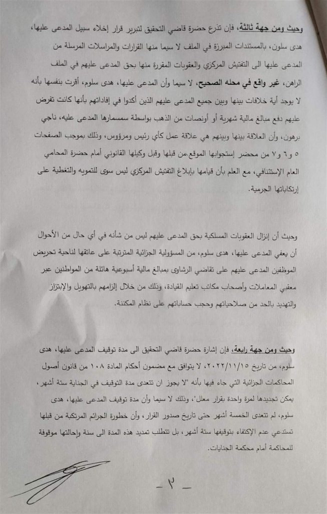 – فسخ القرار المستأنف وإبقاء المدعى عليها، هدى سلوم، قيد التوقيف الاحتياطي.