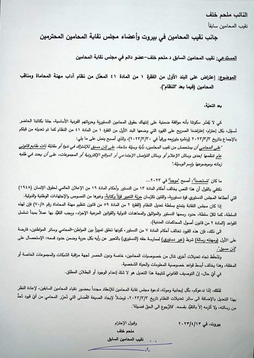 وجاء في كتاب خلف، “بعد التحيّة، كي لا يُفسَّر سكوتنا بأنه موافقة ضمنية على إنتهاك حقوق المحامين الدستورية وحرياتهم الفردية الأساسية، جئنا بكتابنا الحاضر نُسجِّل، بكل إحترام، إعتراضنا الصريح على القيود التي وضعها البند الأول من الفقرة ١ من المادة ٤١ من النظام كما تم تعديله من قبلكم بالإجماع بتاريخ ٢٠٢٣/٣/٣ (ونشره بتوزيعه ورقياً في ٢٠٢٣/٣/٣٠)، والذي أصبح ينصّ على ما يلي: