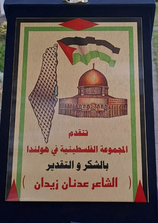 وقد عبر زيدان عن شكره وتقديره لهذه المجموعة والاخوة في هولندا ووعدهم بمتابعة المسيرة الفنية والوطنية والنضالية من أجل اشرف قضية وهي قضية فلسطين.. وكذلك اعتبر هذا الدرع التكربمي وسام شرف يضعه على صدره ..