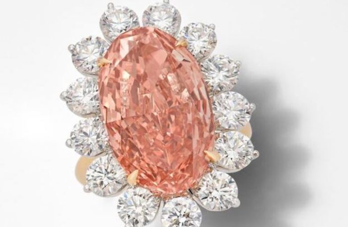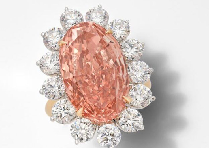 وقالت دار سوثبيز: “الألماسة المركزية الوردية من نوع Fancy Deep Orangy Pink، وتأتي بلون طبيعي ووضوح داخلي لا تشوبه شائبة، مع رسالتين من مؤسسة GIA، إحداهما تشير إلى أن الألماس قد تم تحديده ليكون من النوع (IIa)، والآخر يشهد على ندرته ويشير إلى أنه يستحق اهتمامًا خاصًّا”.