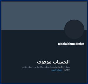 وكتب تويتر على واجهة صفحة @nidalalahmadieh : “الحساب موقوف”، مضيفاً “يعمل تويتر على توقيف الحسابات التي تنتهك قوانين تويتر”.