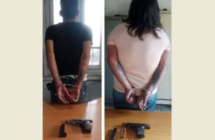 وبتفتيشهما، ضبط بحوزتهما مسدسان حربيّان، وكمية من المخدرات.