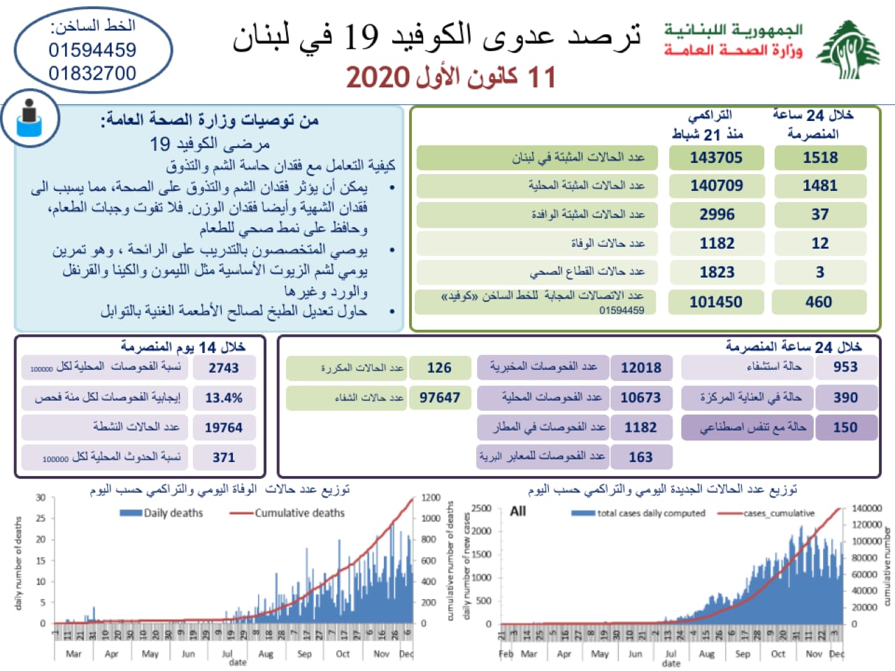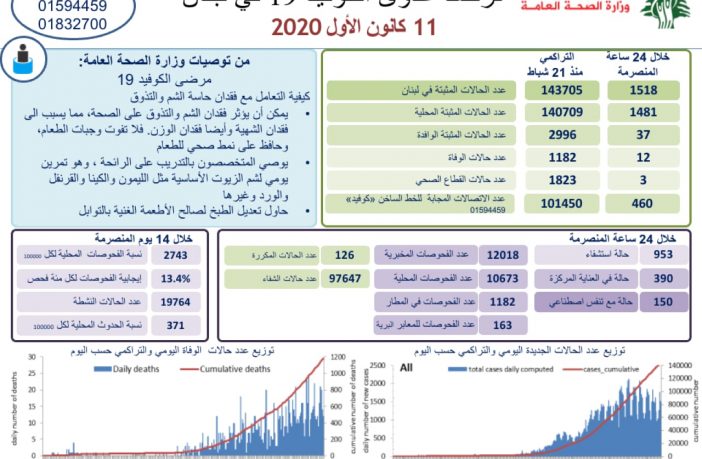 محليات وزارة الصحة اللبنانية: 1518 إصابة جديدة بكورونا و 12 حالة وفاة By F.S ديسمبر 11, 2020 لا توجد تعليقات featured