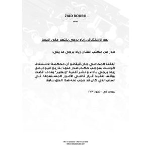 أما رد زياد برجي على الحكم القضائي فكان على شكل بيان صدر عن مكتبه الإعلامي، شاركه عبر ستوري انستقرام وجاء فيه: “لاشك أن قرار العجلة الذي وصلنا اليوم كان مفاجئا لنا بما أننا لم نتبلغ عن وجود أي دعوى في هذا الموضوع ولم يتم الاستماع إلينا أو بيان دفاعنا”.