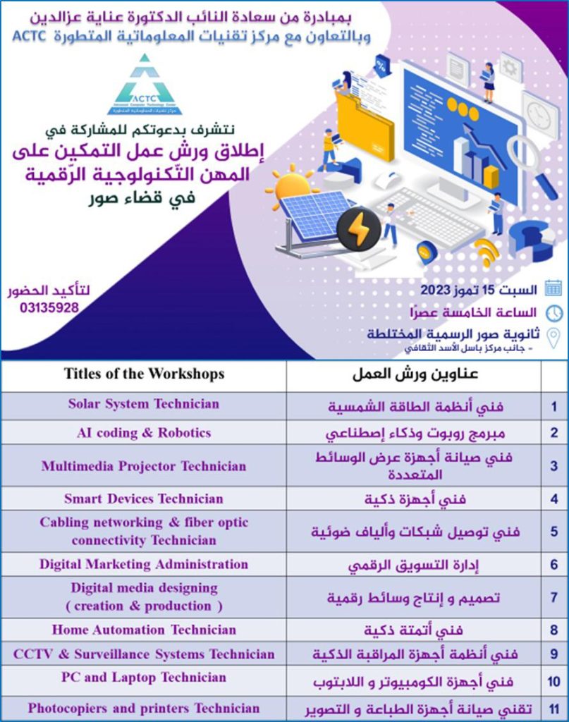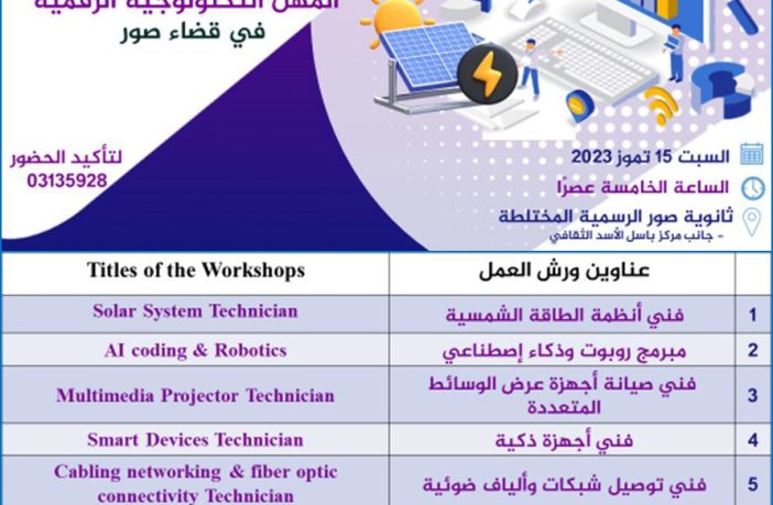 محليات إطلاق ورش عمل التمكين على المهن التكنولوجية الرقمية في قضاء صور بمبادرة من النائب د. عناية عز الدين.. هذا السبت By F.S يوليو 13, 2023 لا توجد تعليقات قضاء صور
