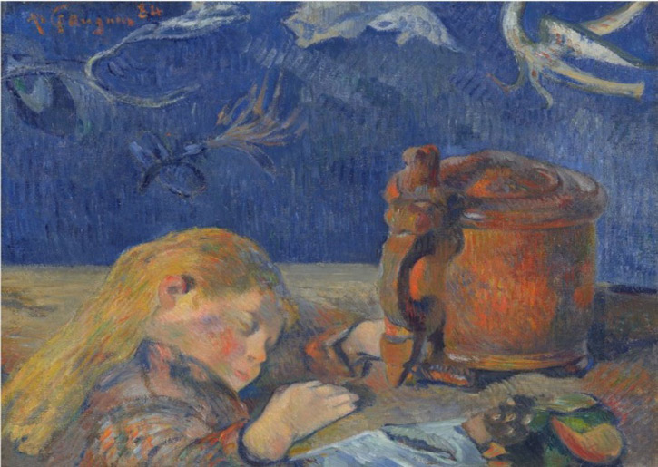 وتابعت الدار: “تصور اللوحة أرضية زرقاء شفقية، وينام كلوفيس الطفل المفضل لدى الفنان بسرعة، وهناك دمية ملقاة على الطاولة القريبة بمثابة رفيق للصبي النائم بينما يلوح في الأفق خزان كبير، كل شيء يشبه الحلم ومذهل”.