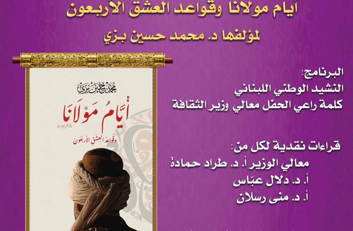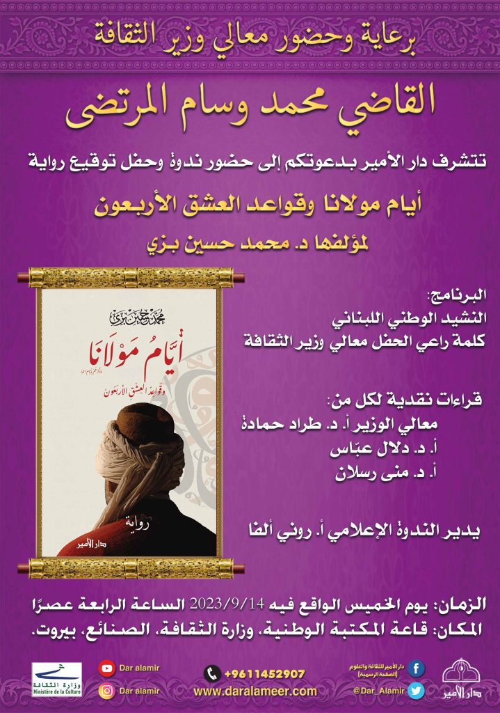 برعاية وحضور معالي وزير الثقافة القاضي محمد وسام المرتضى تتشرّف دار الأمير بدعوتكم إلى حضور ندوة وحفل توقيع رواية “أيام مولانا وقواعد العشق الأربعون” لمؤلفها د. محمد حسين بزي