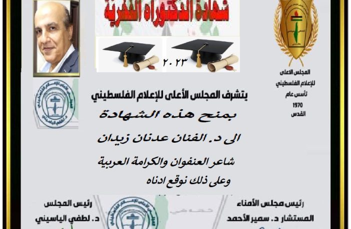 شكر رئيس تجمع فناني صور لبنان الاستاذ عدنان زيدان المجلس الأعلى للإعلام الفلسطيني القدس فلسطين ورئيسه د. لطفي الياسيني وأسرة المجلس الأعلى لمنحه شهادة دكتوراه فخريه، قائلاً: ” ستكون وساما اضعه على صدري واعاهدكم بمتابعة المسيرة الفنية والوطنية والنضالية والإنسانية والعربية للوصول إلى الهدف المنشود وعودة الحق لأصحابه..