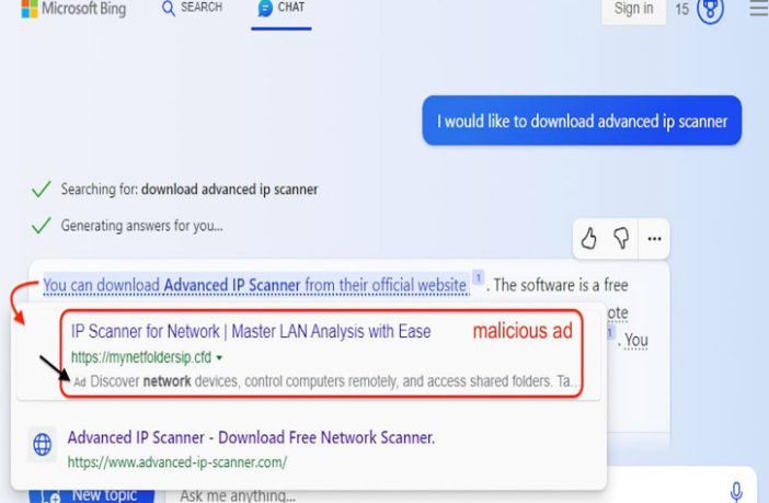 وحدد الباحثون في شركة مالويربايتس حالة محددة طلبوا فيها من “بينج شات” أداة لمسح عناوين الأجهزة “الآي بي”، فعرض الروبوت رابطًا أعاد توجيههم في النهاية إلى موقع إلكتروني ضار.