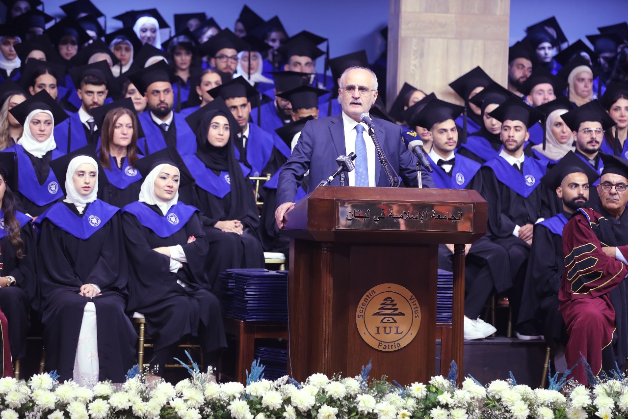 وقال:” أرادها أن تضيف الى التعليم مساحة حوار، ومساحة تلاقي، نستطيع معها أن نعزز مستوى التعليم وقيمة التربية وعمق الثقافة وأهميتها في بناء مجتمعاتنا وأوطاننا . نعم نلتقي أيها الأحبة في الأيام المباركة لرسول الرحمة محمد (صلى الله عليه وآله وسلم)، في أيام ولادته رسولا للإنسانية وللمحبة والحرية وللثقافة الحق والإيمان الحقيقي، ولمتابعة كل ما يعلي شأن الإنسان ودوره في هذه الحياة . وفي أجواء ولادة الإمام جعفر الصادق (عليه السلام)، وهو من أوائل مؤسسي جامعات العلم والمعرفة في تاريخنا الإسلامي الطويل، والذي خرق الحدود المصطنعة للطوائف والمذاهب والأديان، وقدم إنموذجاً راقياً للإمام العظيم بفكره ودينه وعلمه، وفكان الفيلسوف والطبيب وعالم الفلك والفيزيائي والكيميائي، الذي تفتخر به كل منابر ومراكز العلم في هذا العالم . نعم معكم نقف أيها الأعزاء، لأنكم أنتم قلمنا الذي نرسم به مستقبلنا، ولأنكم كل ما دخلنا في مرحلة اليأس، وكلما شعرنا بأننا على أبواب السقوط، نشعر أنكم تضخون فينا الحضور والقوّة والحياة والشعور بالأمل الحقيقي، وترجعون صدى ايماننا وتطلعاتنا نحو الحياة الجديدة، لأنكم تختصرون سيرة جهاد في أيام صعبة صبرا وتعبا وجهدا . نقف معكم اليوم نفخر بأننا شهداء على تخرجكم من المكان الذي إحتضنكم، حاملا بكثير من النظافة والرقي ومستوى التعليم الذي يجب أن تكون عليه مراكز التعليم في لبنان . لقد سلكت الجامعة الإسلامية بشعارها أنها جامعة لكل الوطن، والدرب الصحيح في تفسير حلم الإمام الصدر، بأن تكون كل صروحنا لكل الوطن، على إختلاف مناطقه ومذاهبه وتياراته السياسية وعقائده المختلفة، وان تكون المؤسسات ملتقى الحوار والتواصل والجمع بين أبناء الوطن الواحد، وبينهم وبين أشقائهم على مستوى العالم العربي والدول المحيطة . ”