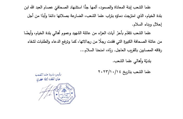 محليات بلدية علما الشعب تتقدّم بأحر التعازي من عائلة الشهيد الصحافي عصام عبد الله By F.S أكتوبر 14, 2023 لا توجد تعليقات علما الشعب