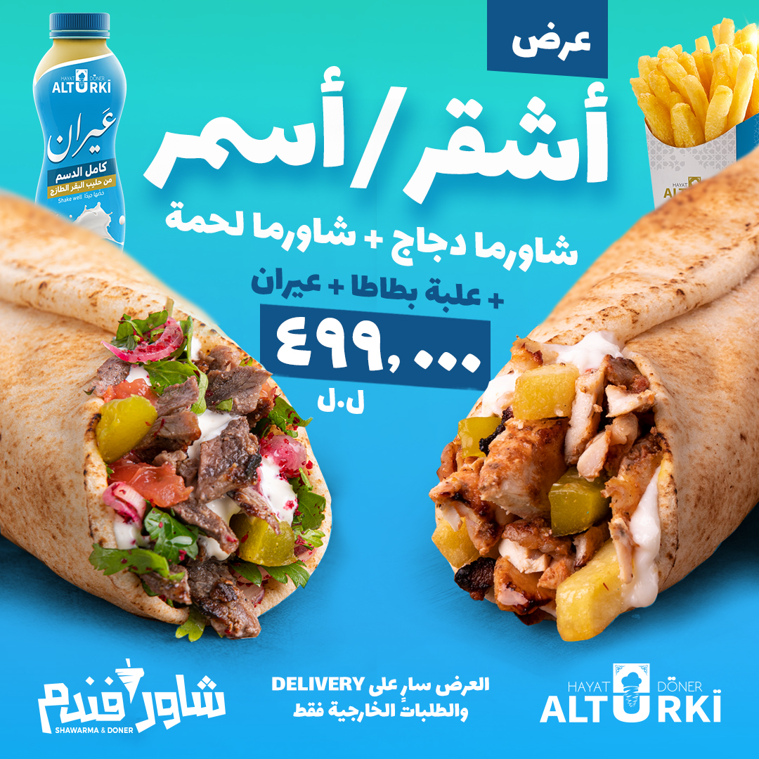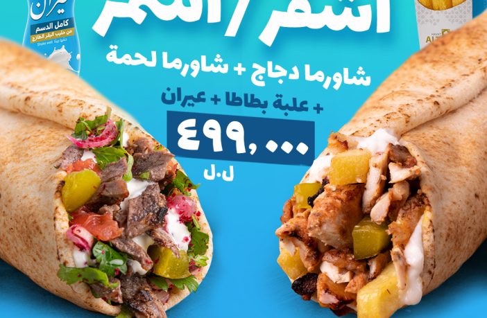 سندويش شاورما دجاج لبناني + سندويش شاورما لحمة لبناني + علبة بطاطا + عيران بـ ٤٩٩٠٠٠ ليرة