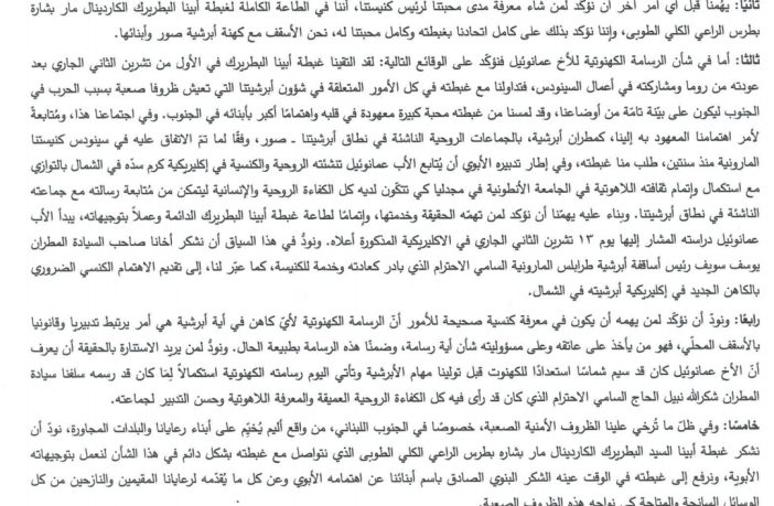 محليات تبيان للحقيقة صادر عن رئيس أساقفة أبرشية صور المارونية المطران شربل عبد الله By F.S نوفمبر 11, 2023 لا توجد تعليقات عبد الله