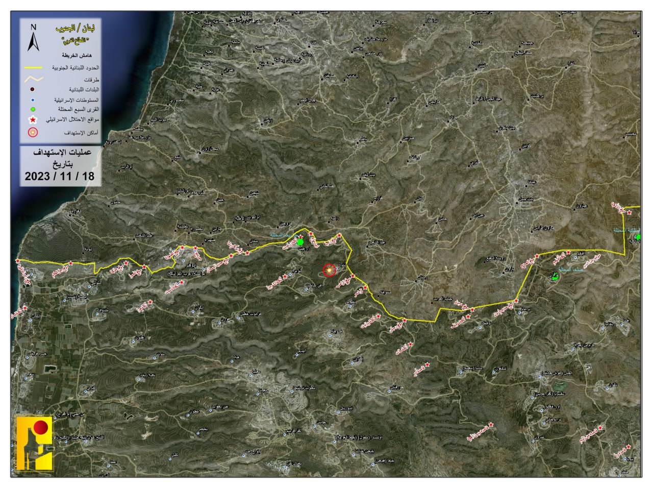 دعماً لشعبنا الفلسطيني الصامد في قطاع غزة وتأييداً لمقاومته الباسلة والشريفة، استهدف مجاهدو المقاومة الإسلامية عند الساعة 10:00 من صباح يوم السبت 18-11-2023 تجمعًا لجنود الاحتلال الإسرائيلي في حرج شتولا بالأسلحة المناسبة وحقّقوا فيه إصابات مباشرة.