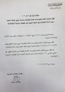 إستنادا للمرسوم رقم 15215 تاریخ 2005/9/27 وتعديلاته، الذي يحدد الأعياد والمناسبات الرسمية، اعلنت رئاسة مجلس الوزراء اقفال جميع الإدارات العامة والمؤسسات العامة والبلديات يومي الجمعة الواقع فيهما 2020/12/25 و 1/ 1/ 2021 ، وذلك بمناسبة عيدي الميلاد ورأس السنة الميلادية.