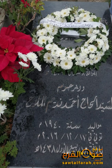في الذكرى الرابعة لرحيل رائد العمل الوطني والانساني الحاج احمد نديم الملاح (ابومحمد) وضع اكليلا من الورود وتمت قراءة الفاتحة على ضريح الراحل بحضور رئيس دائرة أوقاف صور الإسلامية الشيخ عصام كساب و إمام المدينة الشيخ علي حب الله.