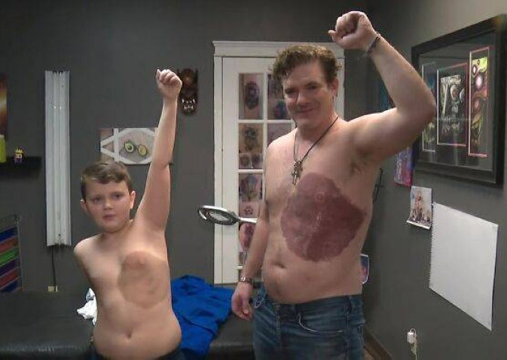 خضع والد في كندا لوخز إبرة صانع الوشوم طوال 30 ساعة، ليرسم على صدره شكلاً مطابقاً لوحمة ولادة كبيرة تغطي جزءاً من صدر ابنه، ليرفع عن الصغير الشعور بالحرج بين أقرانه.