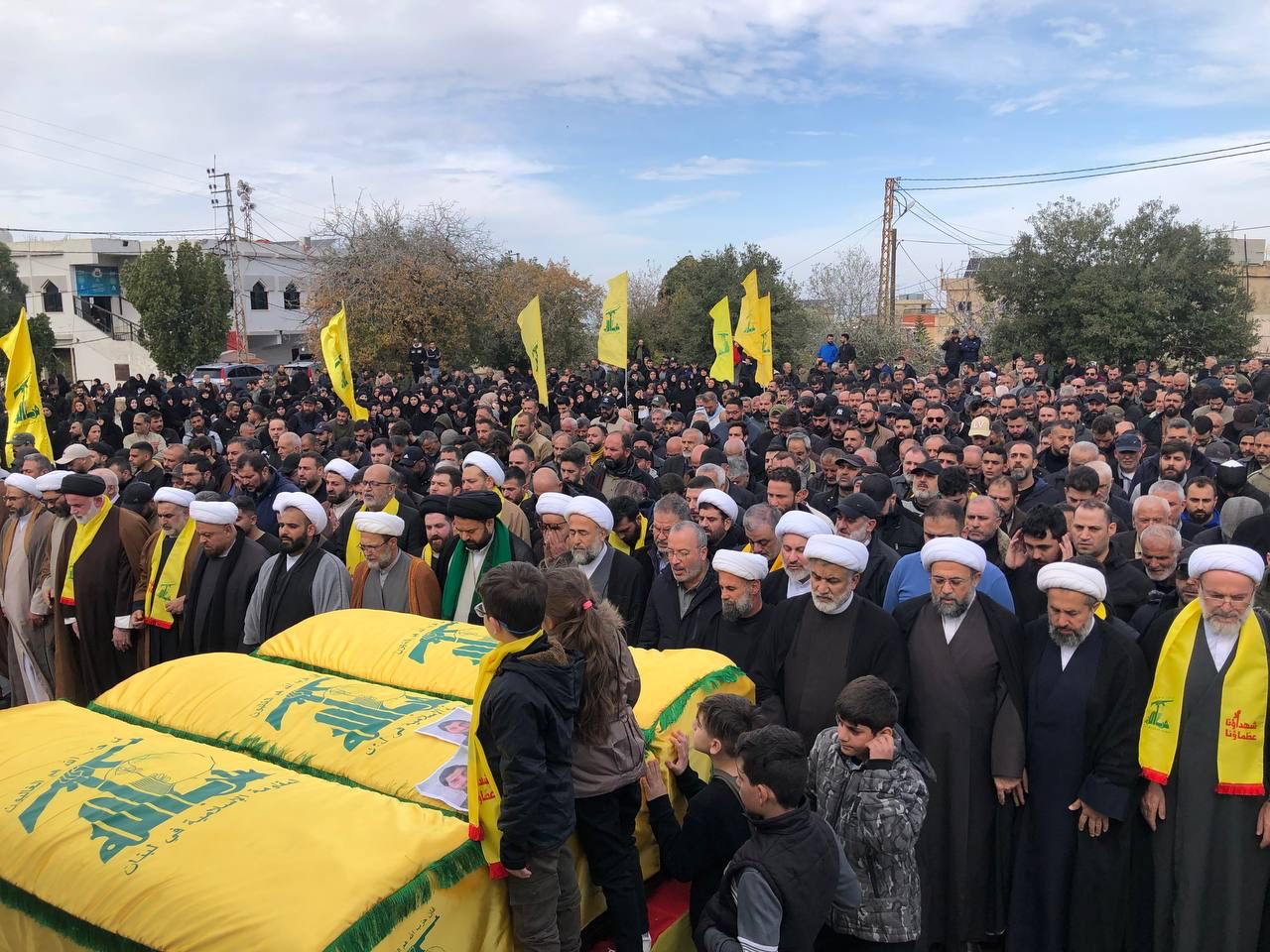 ثم أقيمت مراسم تكريمية للشهداء على وقع عزف موسيقى كشافة الإمام المهدي (عج)، حيث تولت ثلة من المجاهدين حمل النعوش الطاهرة، كما أدّت فرقة عسكرية من المقاومة العهد والقسم للشهداء بالمضي على درب الجهاد والمقاومة، ثم أقيمت الصلاة على جثامين الشهداء، قبل أن تنطلق مسيرة التشييع تجاه روضة الشهداء، حيث ووريت أجسادهم في الثرى.