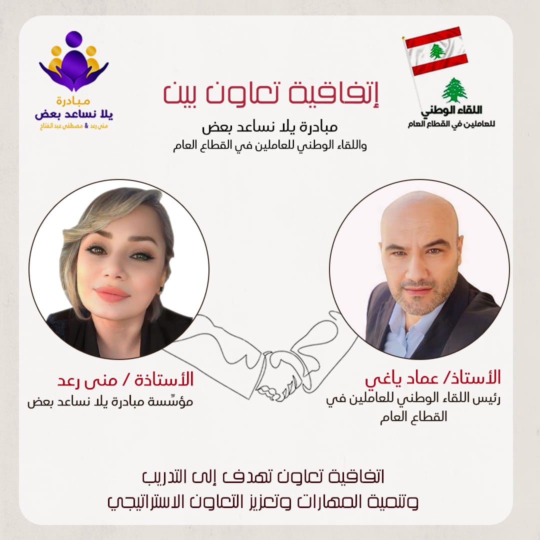 عقد رئيس اللقاء الوطني للعاملين في القطاع العام عماد ياغي من قبل ظهر اليوم في مكتبه إجتماعا ضم رئيسة مبادرة يلا نساعد بعض السيدة منى رعد وفريق عمل المبادرة ، جرى في خلاله توقيع اتفاقية تعاون مشتركة بين اللقاء الوطني والقيمين على المبادرة وتتعلق بالتدريب وتنمية القدرات .