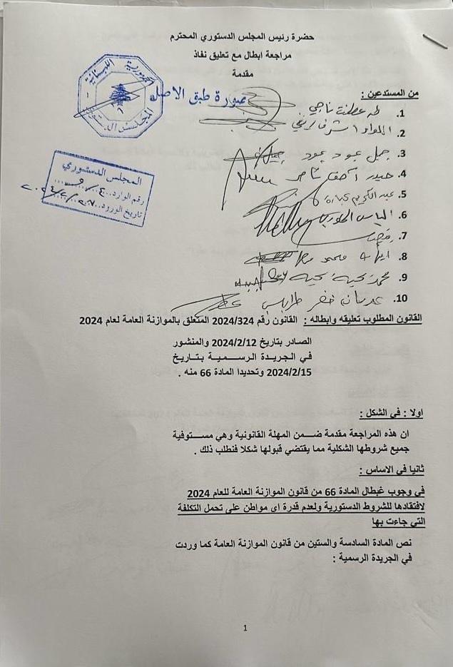 تقدم نواب طرابلس فيصل كرامي ، أشرف ريفي، طه ناجي، ايهاب مطر، كريم كبارة ، ايلي خوري، حيدر ناصر ،جميل عبود، والنائبان محمد يحي وعدنان طرابلسي بطعن لدى المجلس الدستوري لإبطال المادة 66 من قانون موازنة العام 2024 والتي تضمنت زيادات على رسوم معاملات تشكل اعباء ثقيلة على المواطنين لا سيما اخراجات القيد ونحوها.