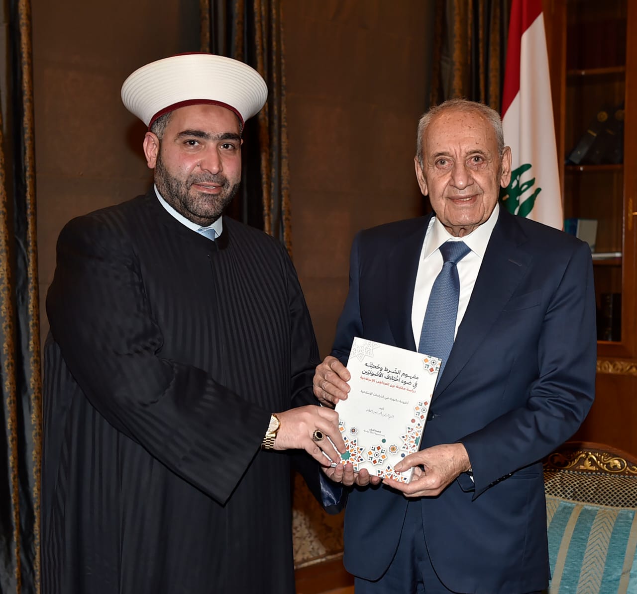 وبعد الظهر استقبل رئيس المجلس رئيس جمعية قولنا والعمل الشيخ احمد القطان الذي سلمه اطروحته لرسالة الدكتوراه بعنوان “مفهوم الشرط وحجيته على إختلاف الأصوليين” ، الشيخ القطان قال بعد اللقاء : تشرفت بلقاء دوله الرئيس نبيه بري الذي نعتبره ضمانة حقيقية ووطنية لهذا البلد ، ونحن دائماً نراه يسعى من أجل وحدة اللبنانيين ومن أجل رأب الصدع فيما بينهم ، وتشرفت باهدائه نسخة عن أطروحة الدكتوراه وهي بعنوان “مفهوم الشرط وحجيته على إختلاف الأصوليين” وهي دراسة مقارنة بين المذاهب الإسلامية ، وقد إستفدت من دولته بما لديه من باع طويل وفكر إسلامي عميق .