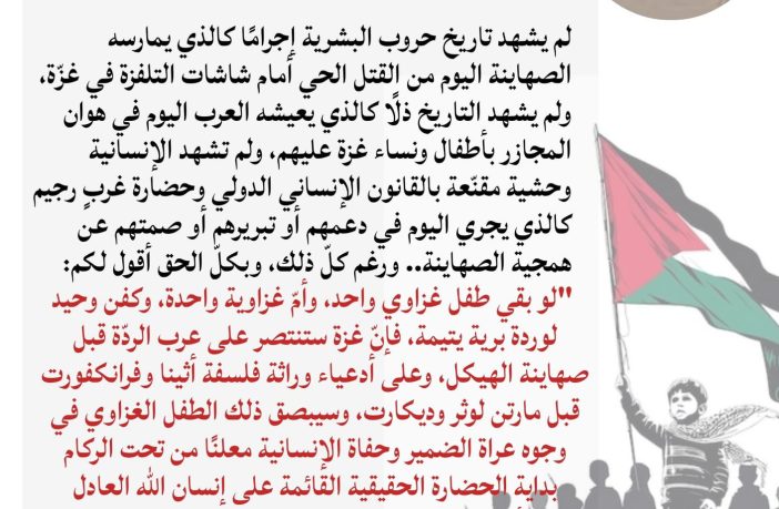 لم يشهد تاريخ حروب البشرية إجرامًا كالذي يمارسه الصهاينة اليوم من القتل الحي أمام شاشات التلفزة في غزّة، ولم يشهد التاريخ ذلًا كالذي يعيشه العرب اليوم في هوان المجازر بأطفال ونساء غزة عليهم، ولم تشهد الإنسانية وحشية مقنّعة بالقانون الإنساني الدولي وحضارة غربٍ رجيم كالذي يجري اليوم في دعمهم أو تبريرهم أو صمتهم عن همجية الصهاينة.. ورغم كلّ ذلك، وبكلّ الحق أقول لكم: لو بقي طفل غزاوي واحد، وأمّ غزاوية واحدة، وكفن وحيد لوردة برية يتيمة، فإنّ غزة ستنتصر على عرب الردّة قبل صهاينة الهيكل، وعلى أدعياء وراثة فلسفة أثينا وفرانكفورت قبل مارتن لوثر وديكارت، وسيبصق ذلك الطفل الغزاوي في وجوه عراة الضمير وحفاة الإنسانية معلنًا من تحت الركام بداية الحضارة الحقيقية القائمة على إنسان الله العادل والأخلاق المنصورة بالقيم العليا لذلك الإنسان حيث النهايات تكتب أصحابها.