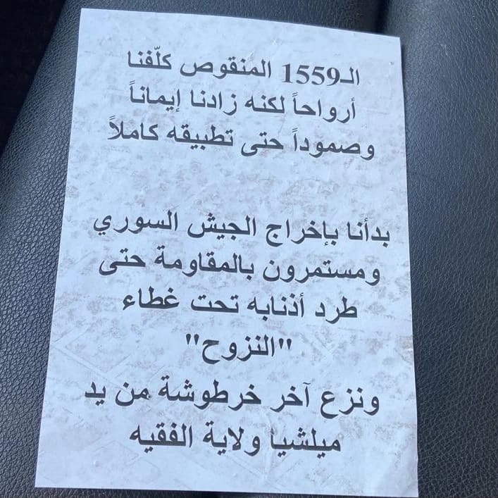 “الـ1559 المنقوص كلفنا أرواحاً لكنه زادنا إيمانا وصمودا حتى تطبيقه كاملا. بدأنا بإخراج الجيش السوري ومستمرون بالمقاومة حتى طرد أذنابه تحت غطاء “النزوح” ونزع آخر خرطوشة من يد ميليشيا ولاية الفقية”.
