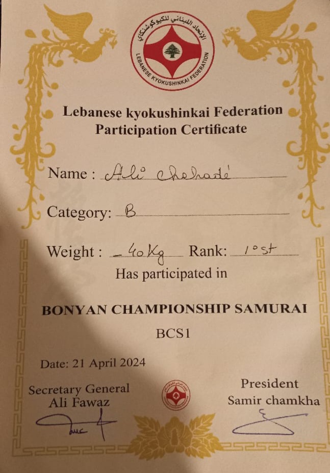 حقق الفتى علي فؤاد شحادة، البالغ من العمر 12 عامًا، إنجازًا رائعًا بفوزه بالمركز الأول في بطولة BONYAN CHAMPION SHIP لفئة وزن 40 كيلوغرامًا.