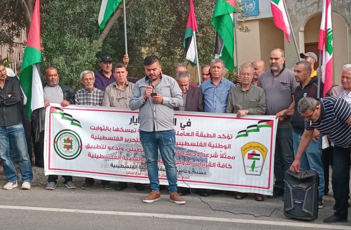 وقال عانت الطبقة العاملة الفلسطينية في لبنان الكثير من الحرمان والتمييز لإعتبارات لبنانية مختلفة بحجة الحفاظ على اليد العاملة اللبنانية وأمام كل ذلك نؤكد بإسم اتحاد نقابات عمال فلسطين فرع لبنان على ما يلي: -الوقوف إلى جانب اهلنا في غزة والضفة والقدس وكل فلسطين.